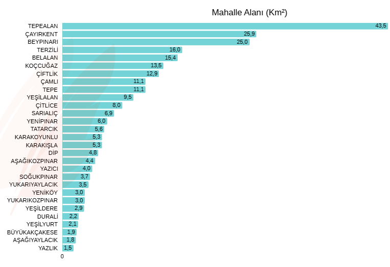 İlçenin yüz ölçümü bakımından en büyük mahallesi 43,5 𝒌𝒎² ile Tepealan olurken, onu 25,9 𝒌𝒎² ile Çayırkent ve 25,0 𝒌𝒎² ile Beypınarı takip ediyor. Bu geniş araziler, ilçenin yayla kültürü ve tarımsal faaliyetleri için hayati önem taşıyan ana gövdesini oluşturuyor.