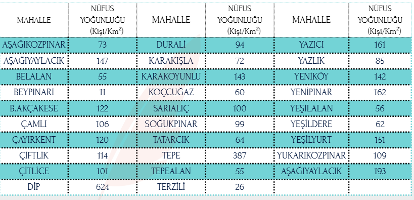 Buna karşın, nüfus yoğunluğunun zirve yaptığı Dip Mahallesi yalnızca 4,8 𝒌𝒎², en yoğun üçüncü bölge olan Aşağıyaylacık ise sadece 1,8 𝒌𝒎² gibi oldukça küçük bir yüz ölçümüne sahip.
